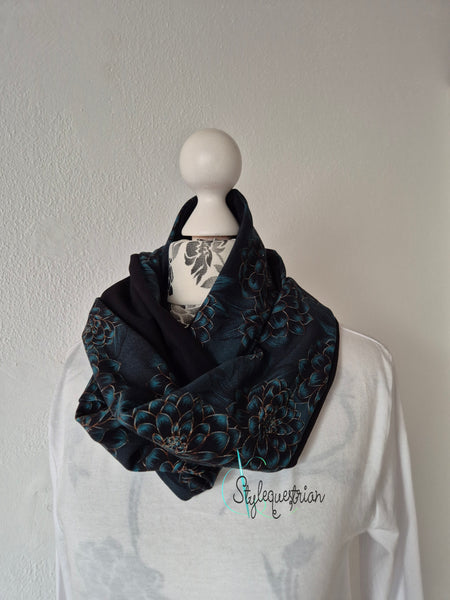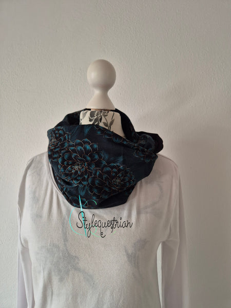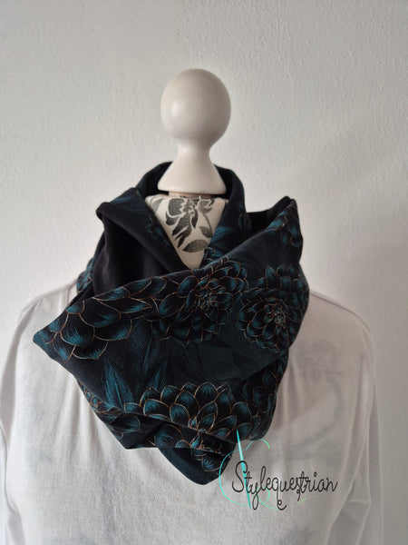 Dieser stilvolle Loop-Schal überzeugt mit einem eleganten Dahlienblüten-Design in Petrol und Schwarz. Die schlichte schwarze Innenseite sorgt für einen harmonischen Kontrast und macht den Loop vielseitig kombinierbar. Gefertigt aus hochwertigem French Terry ist er angenehm weich, leicht elastisch und ideal für die Übergangszeit.