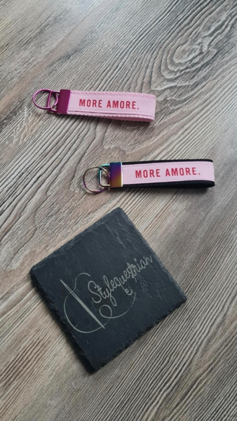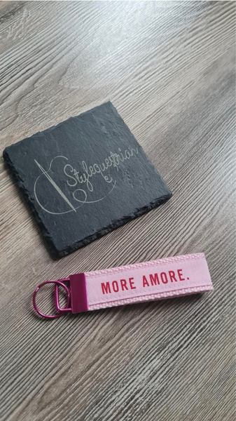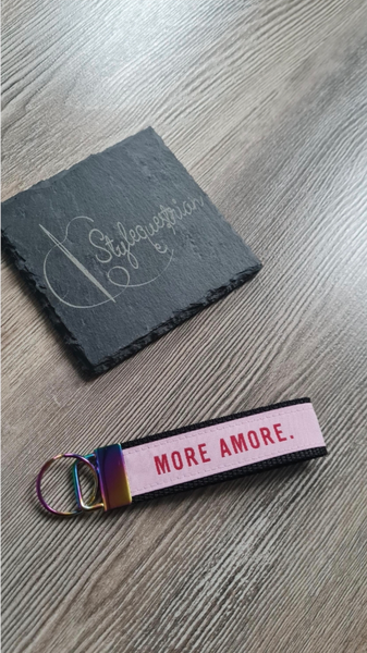 Diese Schlüsselanhänger bestehen aus schwarzem oder rosafarbenem, 25mm breitem Gurtband, auf welches ein Webband mit dem Spruch "More Amore" aufgenäht wurde. Versehen wird der Schlüsselanhänger mit einem rainbowfarbenem (schwarzes Gurtband) oder pinkfarbenem Verschluss (rosa Gurtband) mit Schlüsselring. Der Schlüsselanhänger ist ca. 10cm lang.